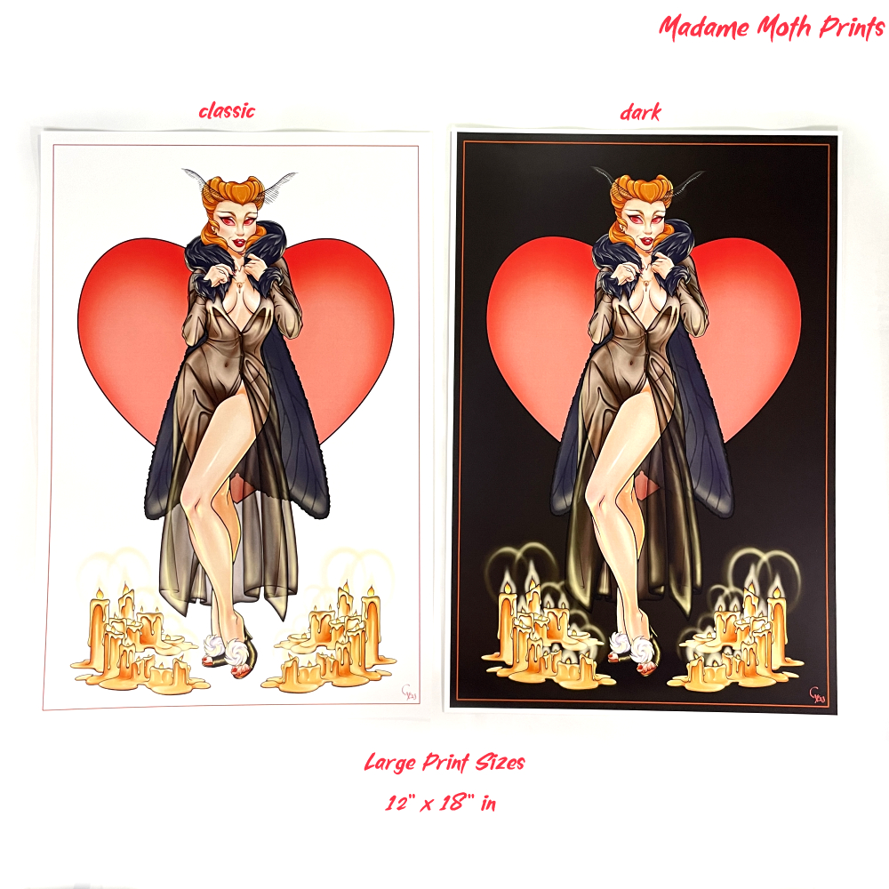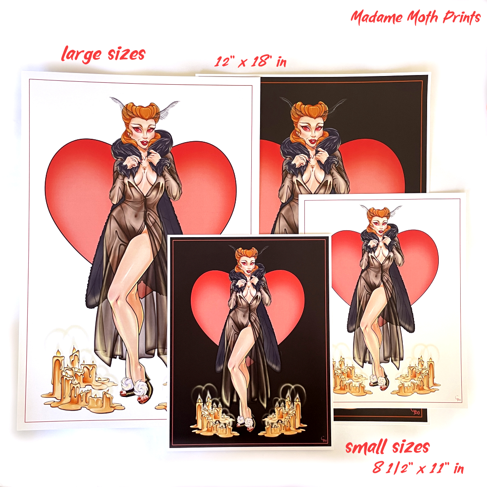 Printed on light cardstock satin, this beautiful full-color print is a conversation starter to be sure! Madame Moth gives a sultry dark mothman vibe to any space. Be daring and put her in the entranceway to really set the tone for who you are when guests enter your home: a proud lover of kitschy modern monster girl pinup art!