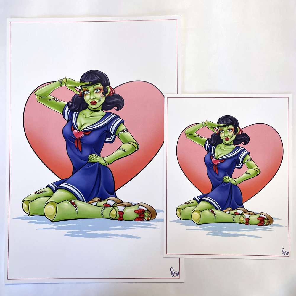 Printed on light cardstock satin, this beautiful full-color print is a conversation starter to be sure! This naughty nautical doll gives a colorful seaside zombie vibe to any space. Be daring and put her in the entranceway to really set the tone for who you are when guests enter your home: a proud lover of kitschy modern monster girl pinup art!