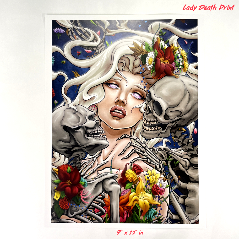 Printed on light cardstock satin, this vibrant full-color print is a conversation starter for sure! Lady Death is a highly detailed illustration with inspiring imagery that conjures up all manner of dreams. Stare at this beautiful art on your wall and let it inspire you every day.